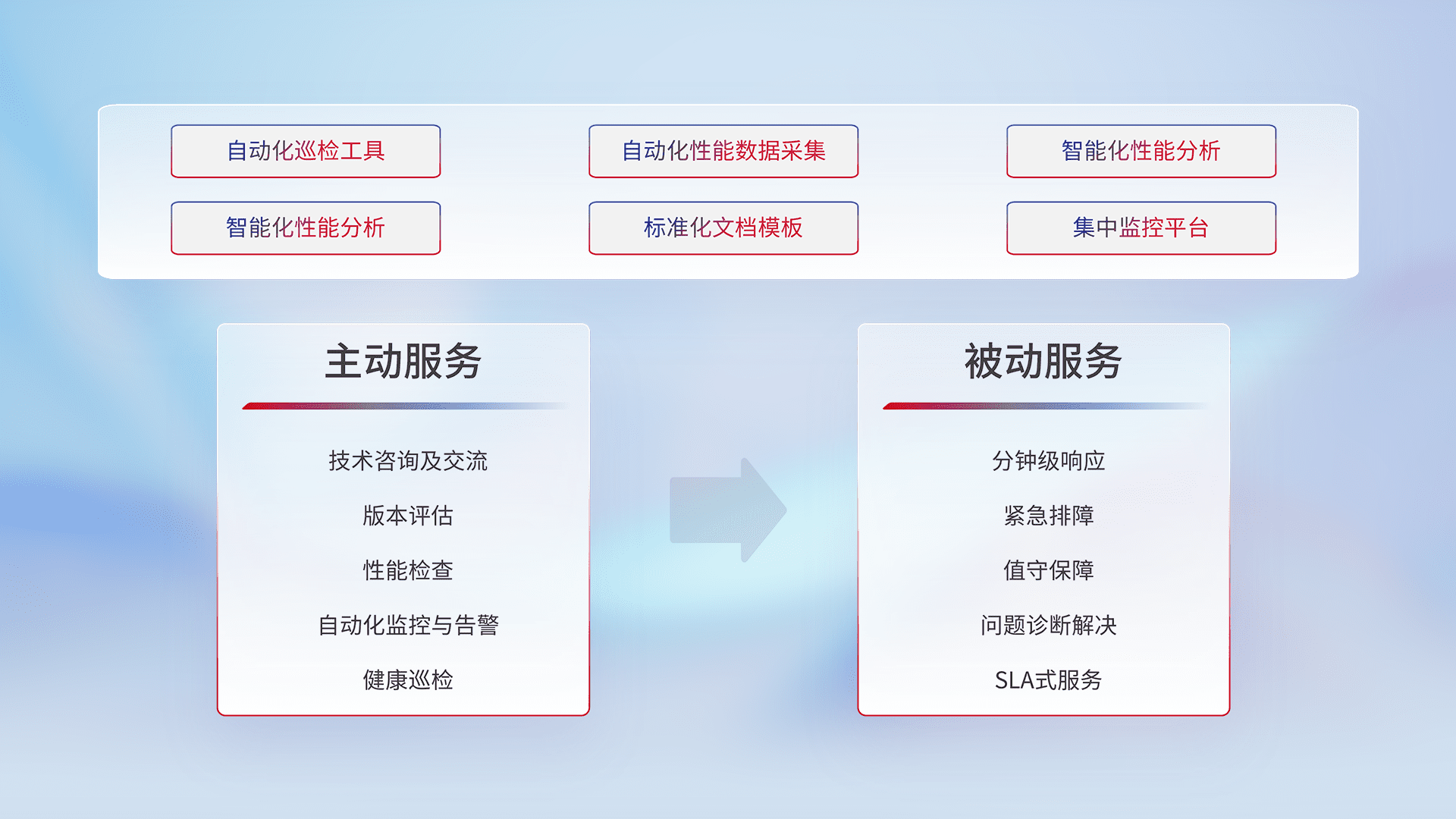 智能化工具和标准化文档,,,保障服务质量,,,,提供主动服务(包含技术咨询、、、、版本评估、、、性能检查、、、、自动化监控与告警、、、、健康巡检)和被动服务包含(分钟级响应、、、、紧急排障、、、值守保障、、、问题诊断解决、、、SLA服务)。。。。