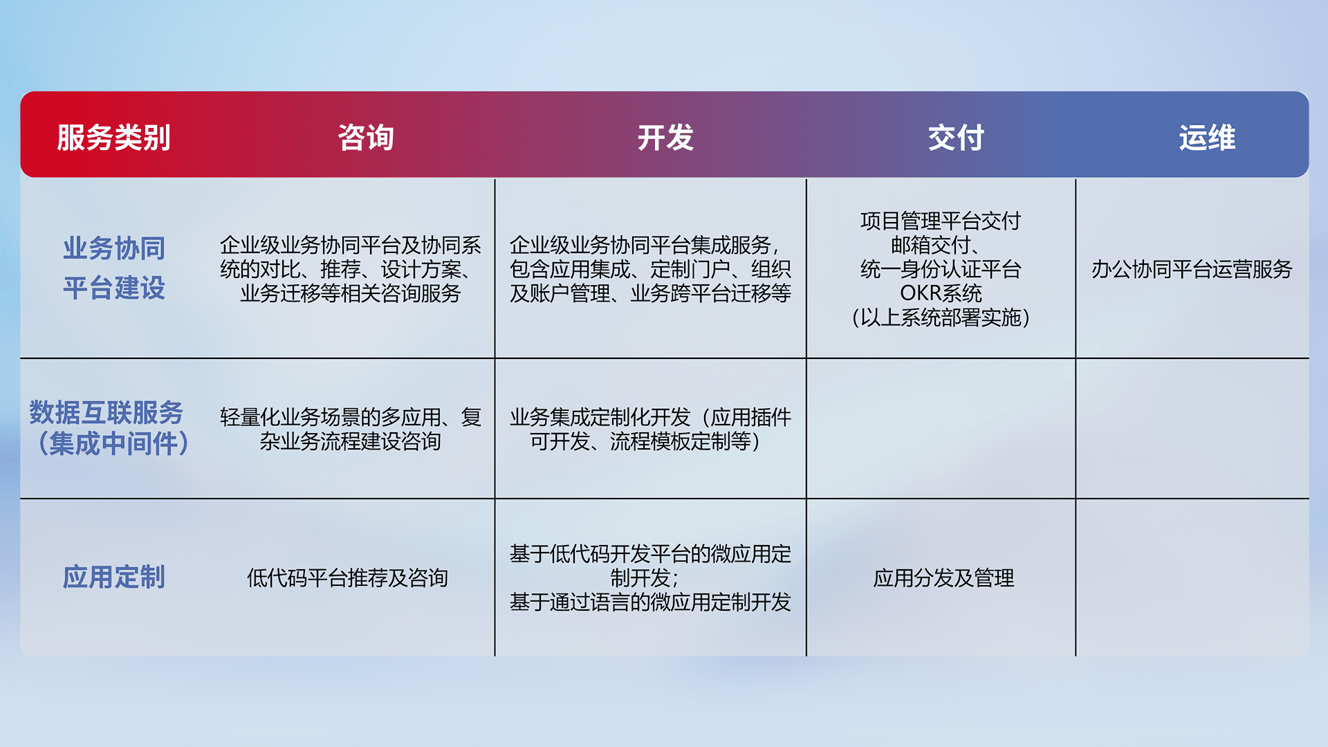 针对钉钉、、企微、、IDaas等平台级产品提供产品的规划、、、方案、、、交付、、、定制化开发等服务,,,,实现如统一协同办公、、、智能客户服务、、、混合会议管理、、、智能数据查询、、等业务场景,,,,实现数字化转型。。。。